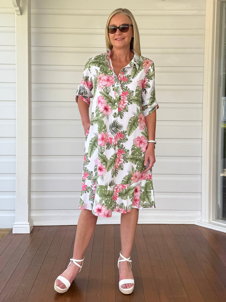 - Made from lightweight fabric, this midi-length dress features a crisp white backdrop adorned with lush green tropical leaves and vibrant pink blooms, bringing a touch of island-inspired charm to your wardrobe.