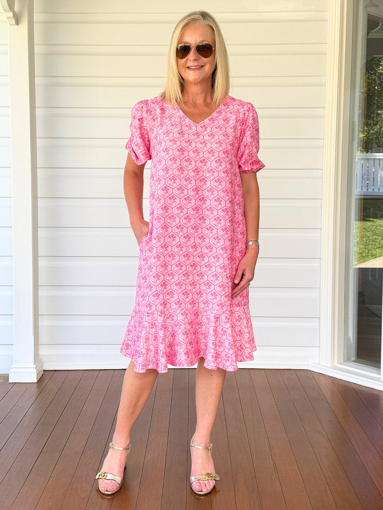 - Featuring a flattering V-neckline, short puff sleeves with elastic cuffs, and a relaxed fit that flows into a feminine flounce hem, this dress combines comfort and charm.