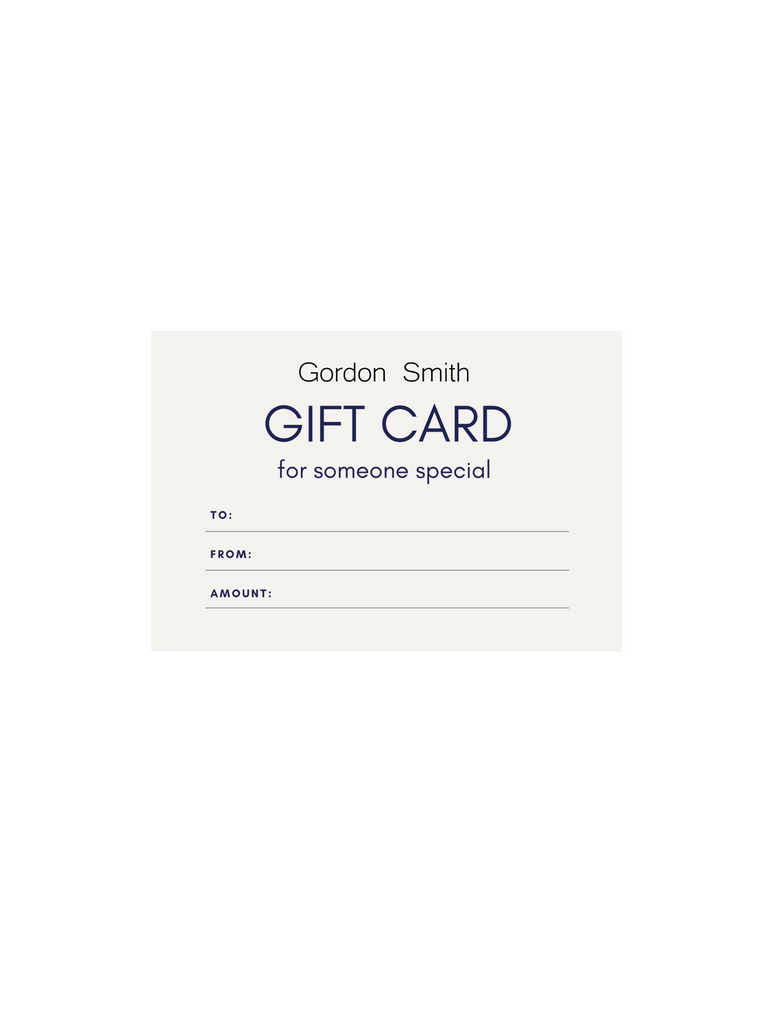 Shopping for someone else but not sure what to give them? Give them the gift of choice with a Gordon Smith Online Gift Card. Just choose your Gift Card amount, add to bag and you're done - gifts made easy! Our Virtual Gift Cards are delivered instantly by email and contain instructions on how to redeem them at checkout.