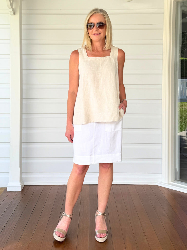 - The Miley Lino Cami is a breezy warm-weather essential, designed with a flowy silhouette and a modern square neckline for a touch of effortless charm.