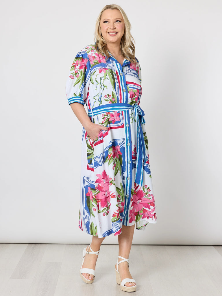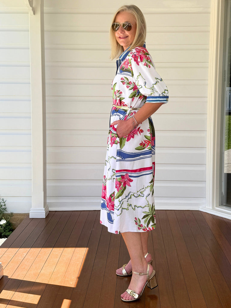 - Channel timeless coastal glamour with The Monaco Print Dress, a striking piece that blends bold florals with nautical-inspired stripes.