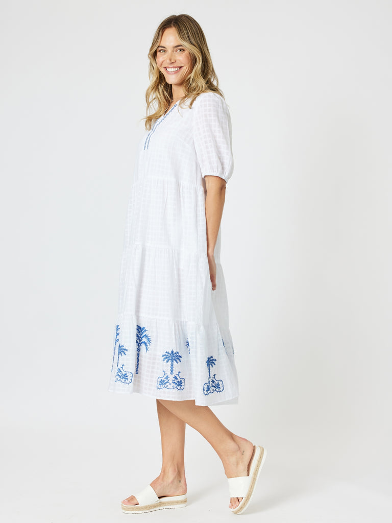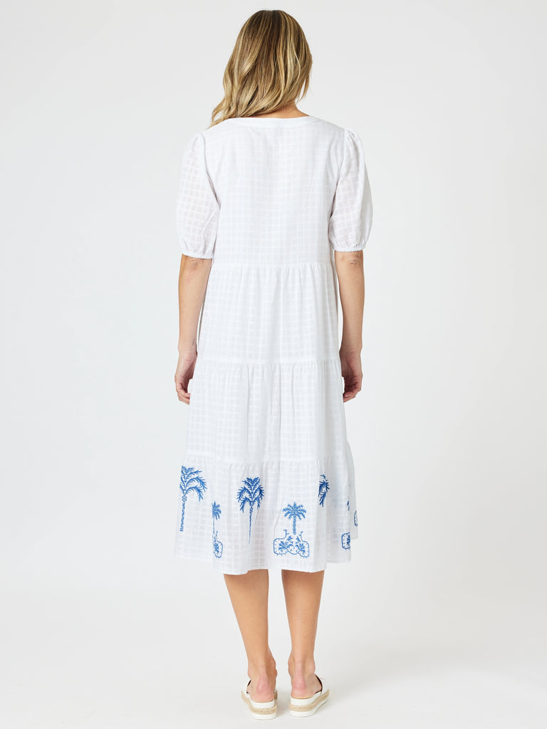 - Crafted from soft white cotton with a subtle check texture, this midi dress is beautifully detailed with intricate blue embroidery along the neckline and hem, featuring delicate palm motifs for a touch of island elegance.