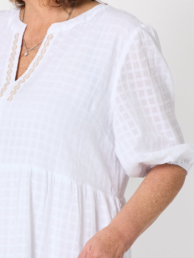 - Crafted from soft white cotton with a subtle check texture, this midi dress is beautifully detailed with intricate gold embroidery along the neckline and hem, featuring delicate palm motifs for a touch of island elegance.