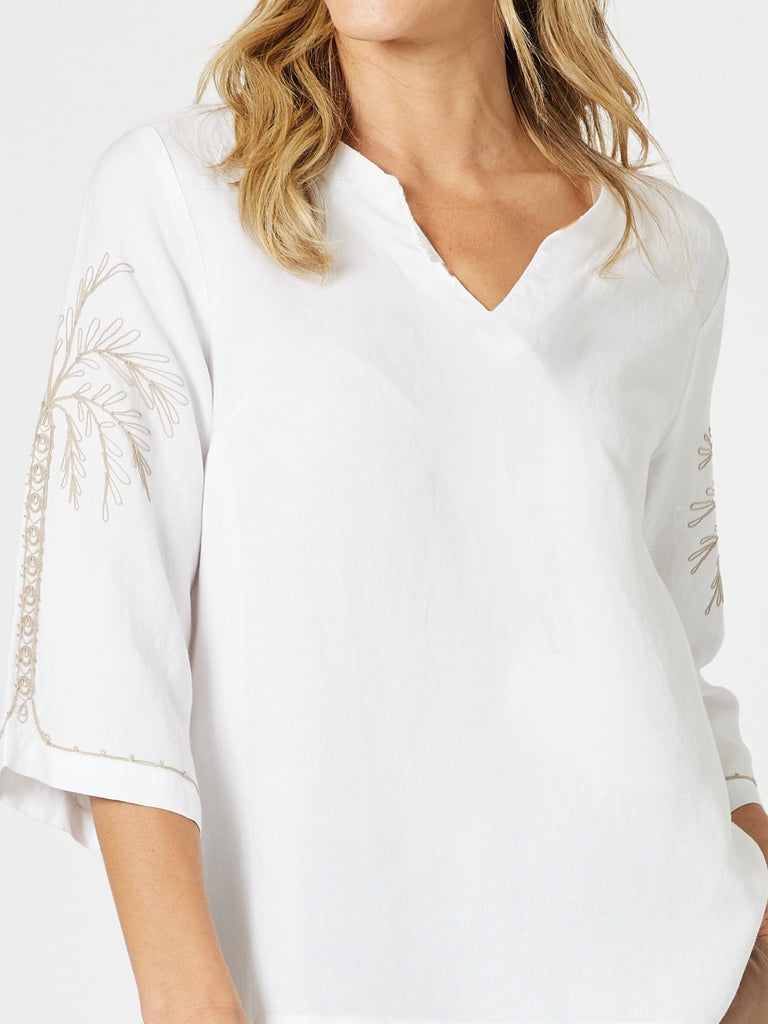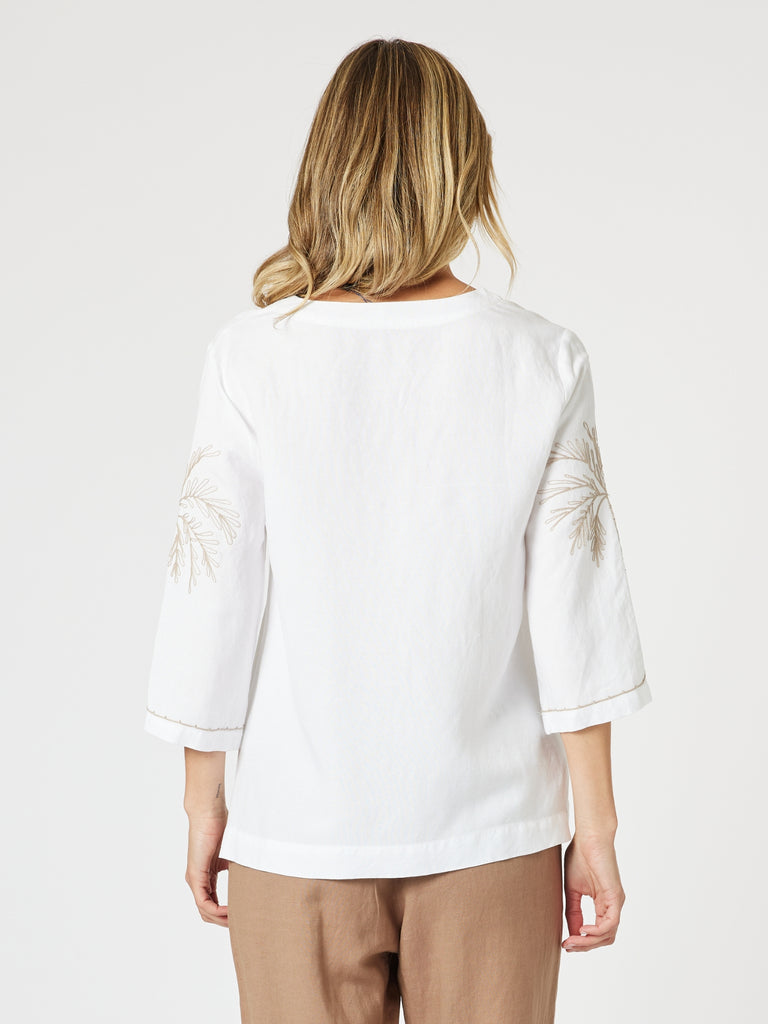 - Made from a lightweight linen-blend fabric, this top features beautiful white palm embroidery along the 3/4 length sleeves for a tropical-inspired touch.