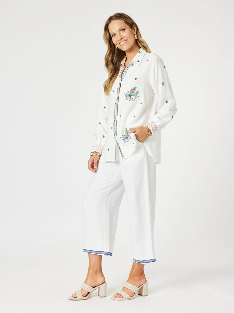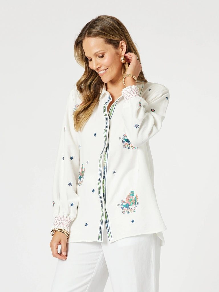 - Featuring beautifully embroidered peacock motifs and scattered star details, this crisp white button-down adds personality to your wardrobe.