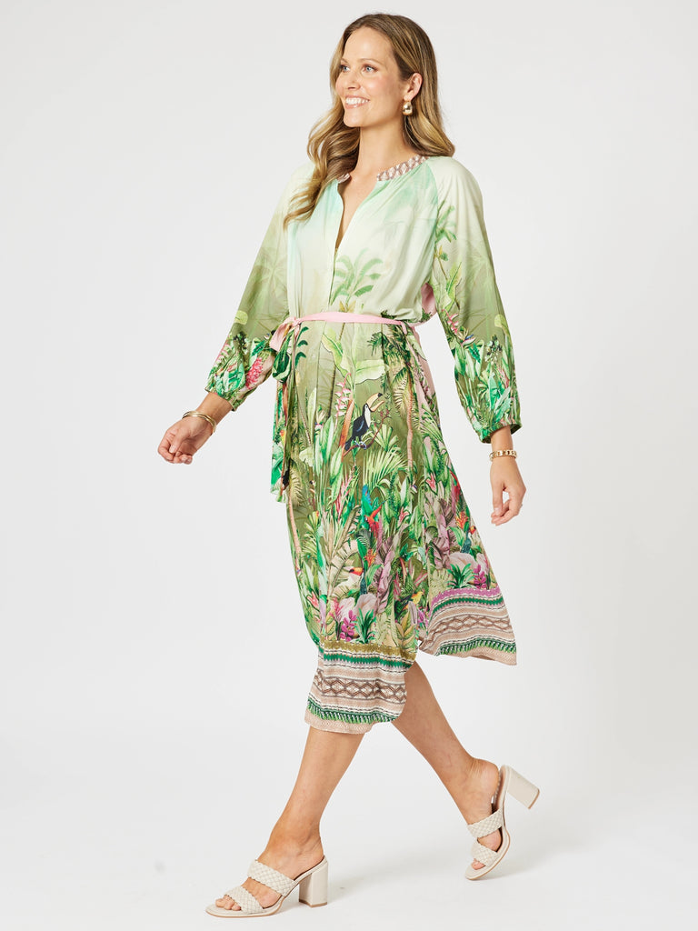 - Featuring a lush rainforest scene with vibrant greenery and exotic toucans, this lightweight piece is detailed with a soft V-neckline, full-length sleeves with elasticated cuffs, and a contrasting border hem.