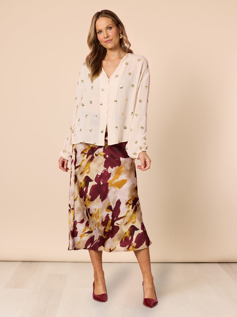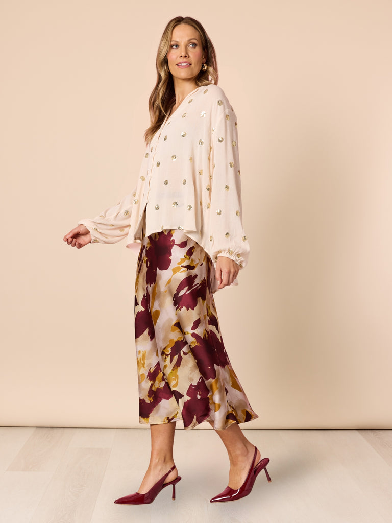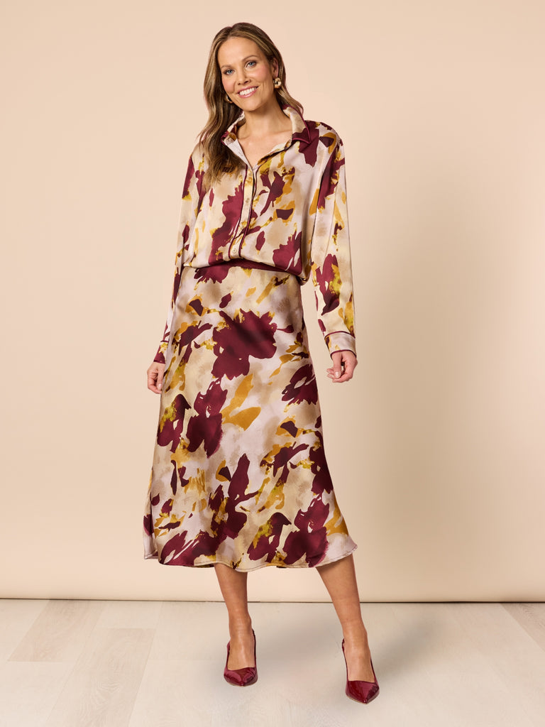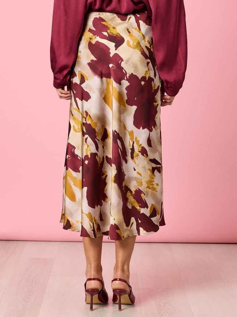 • Crafted from a soft satin fabric with a beautiful drape and gentle sheen, this midi-length skirt features an artful abstract floral print in rich tones of shiraz, gold, and champagne.